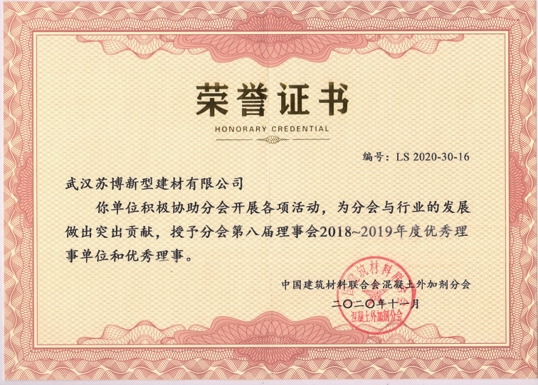 公司是中国建筑材料联合会混凝土外加剂分会、湖北省硅酸盐学会、湖北省预拌混凝土协会常务理事单位,以及中国硅酸盐学会混凝土与水泥制品分会、武汉混凝土协会理事单位。